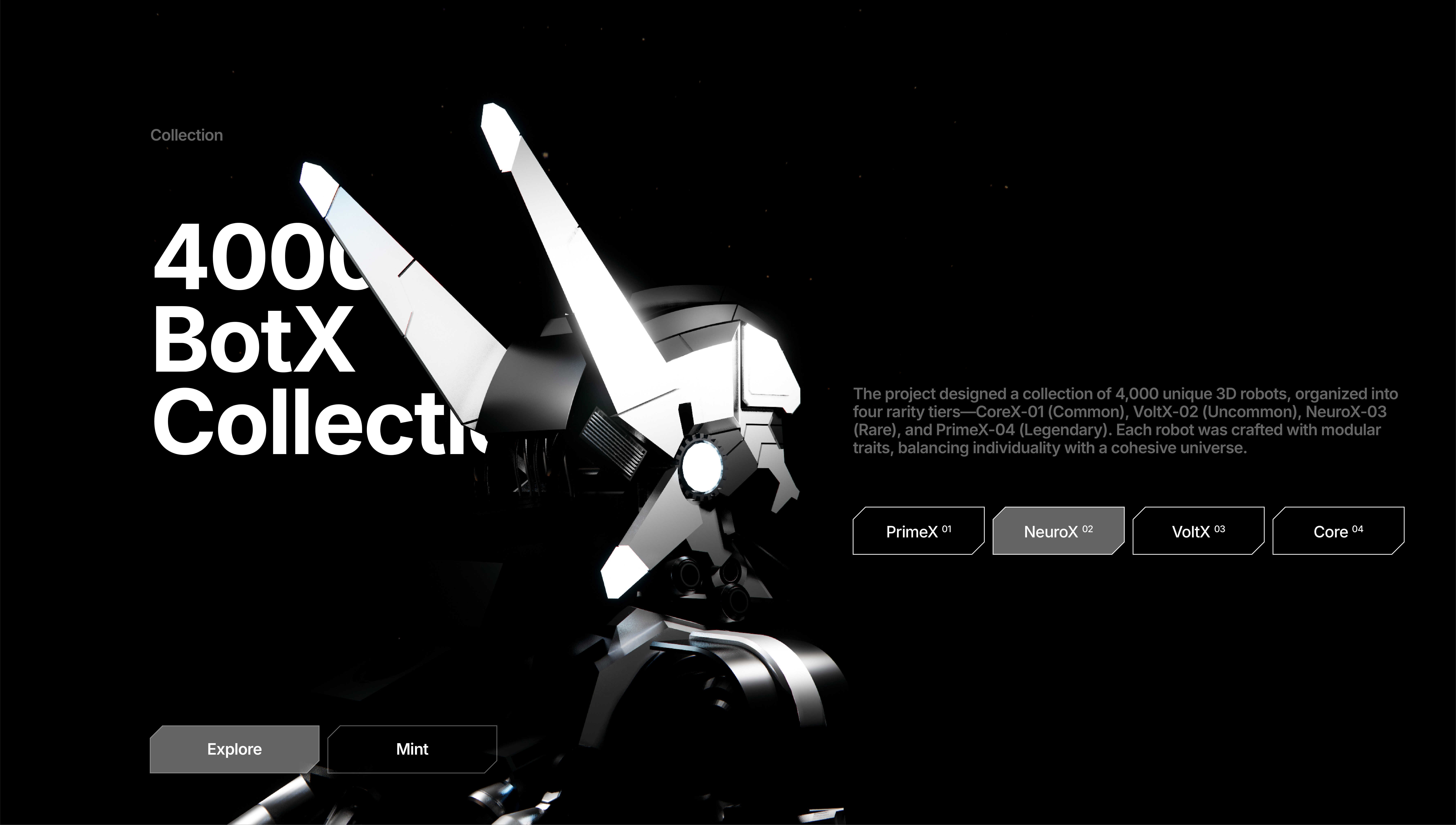 The launch of BotX represents the culmination of intricate world-building and advanced blockchain integration—transforming a conceptual blueprint into a high-fidelity, interactive universe. This phase was defined by the synthesis of sci-fi storytelling and immersive 3D visualization to create a new standard for digital collectibles.