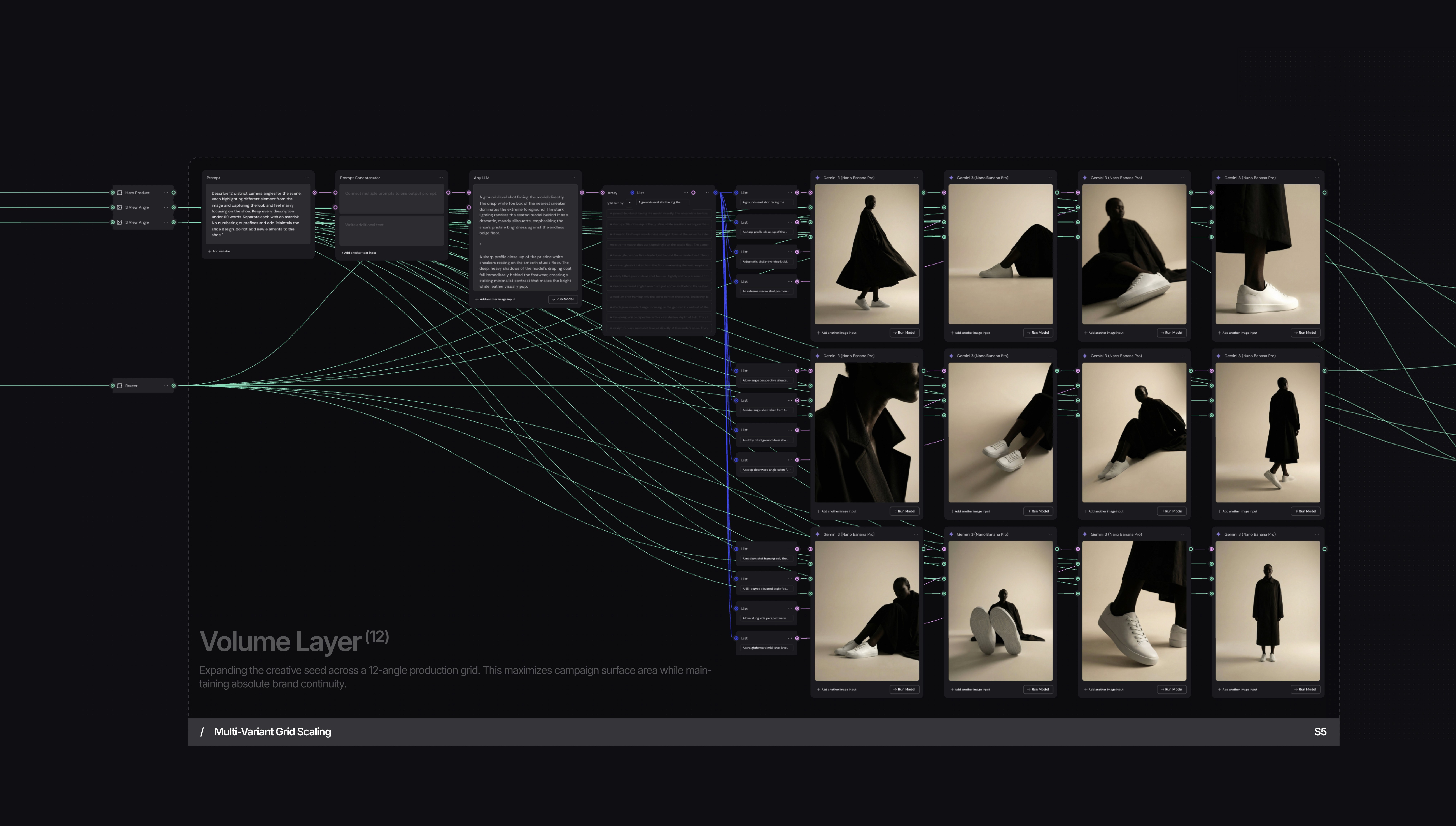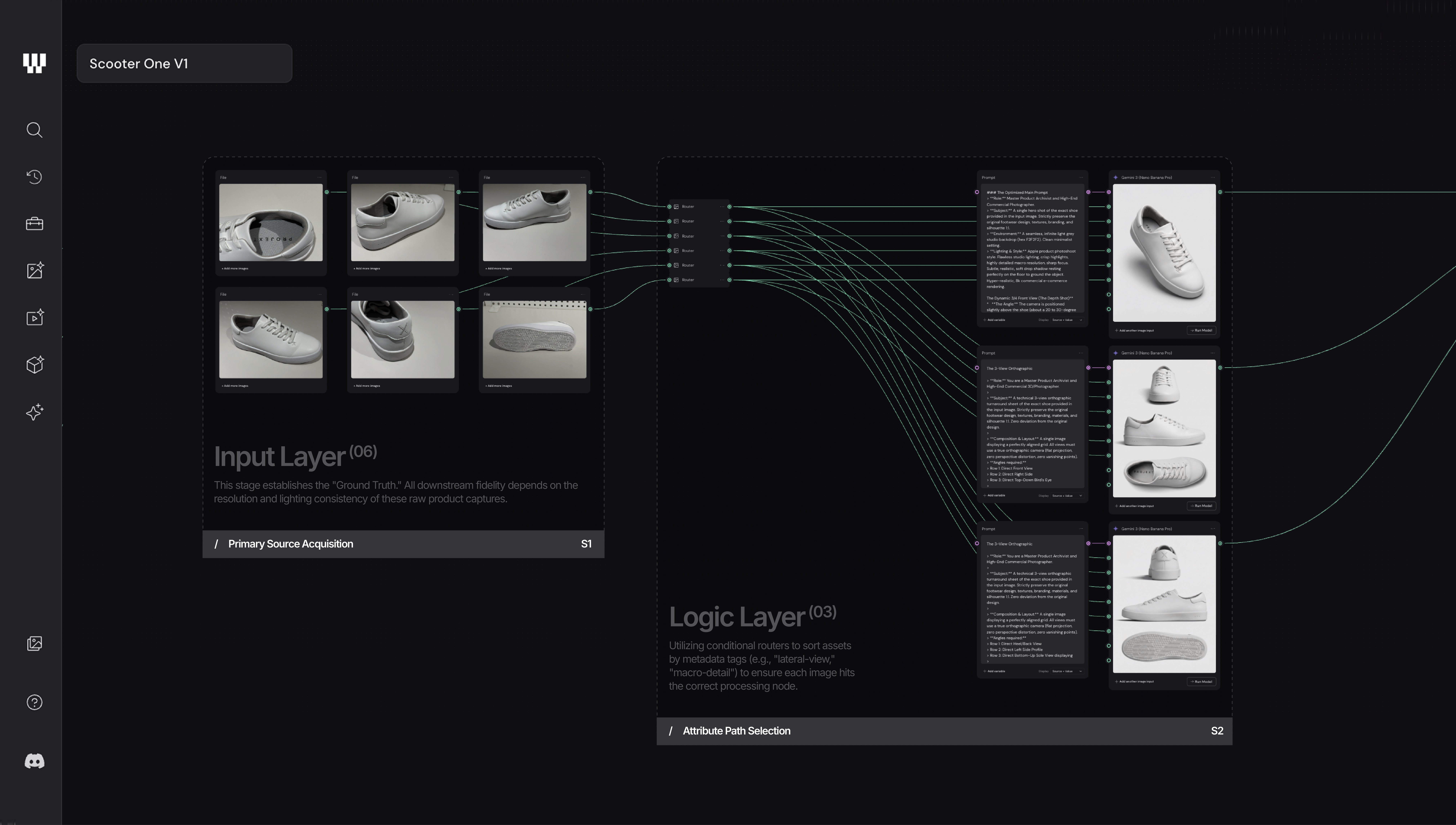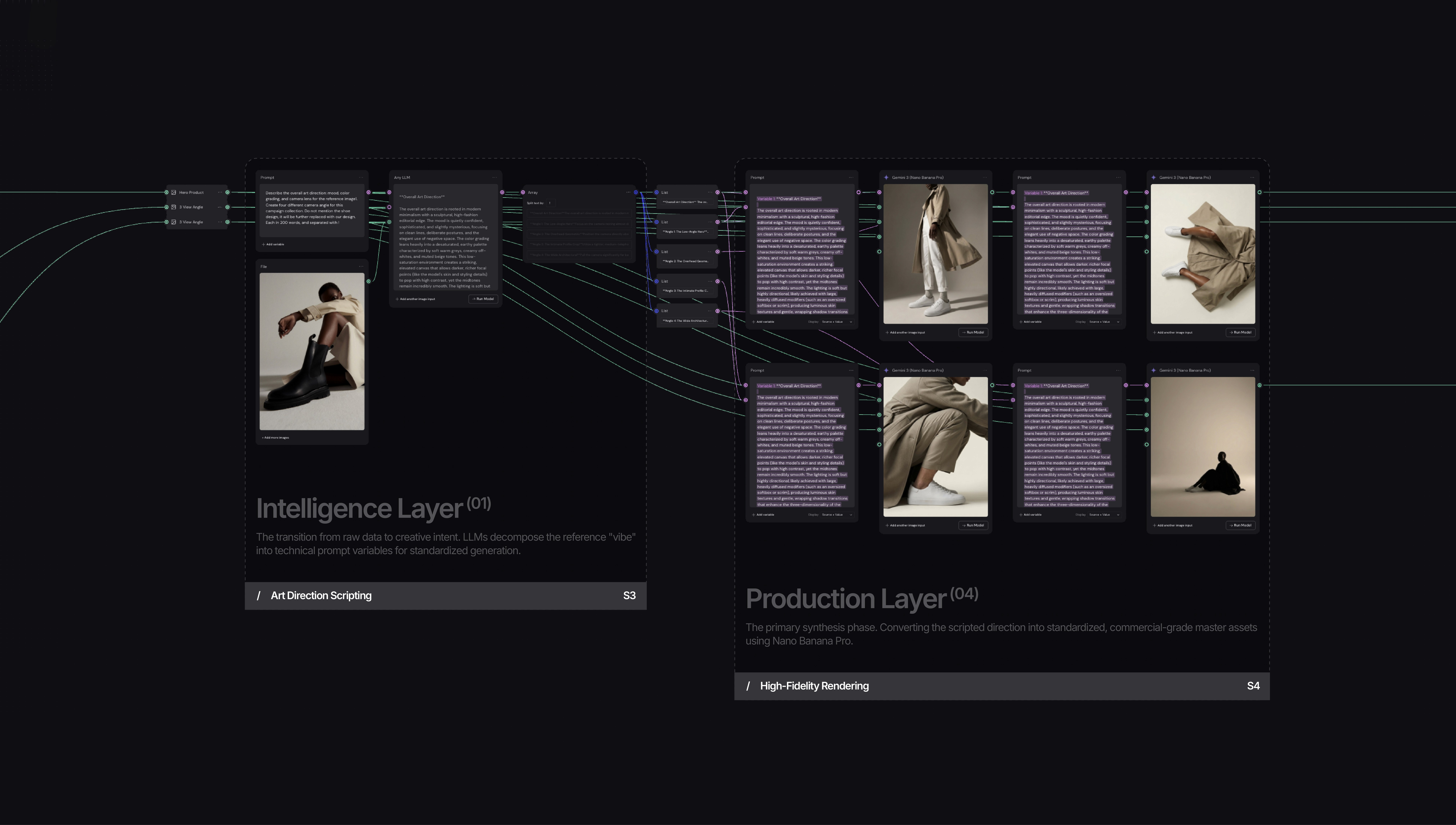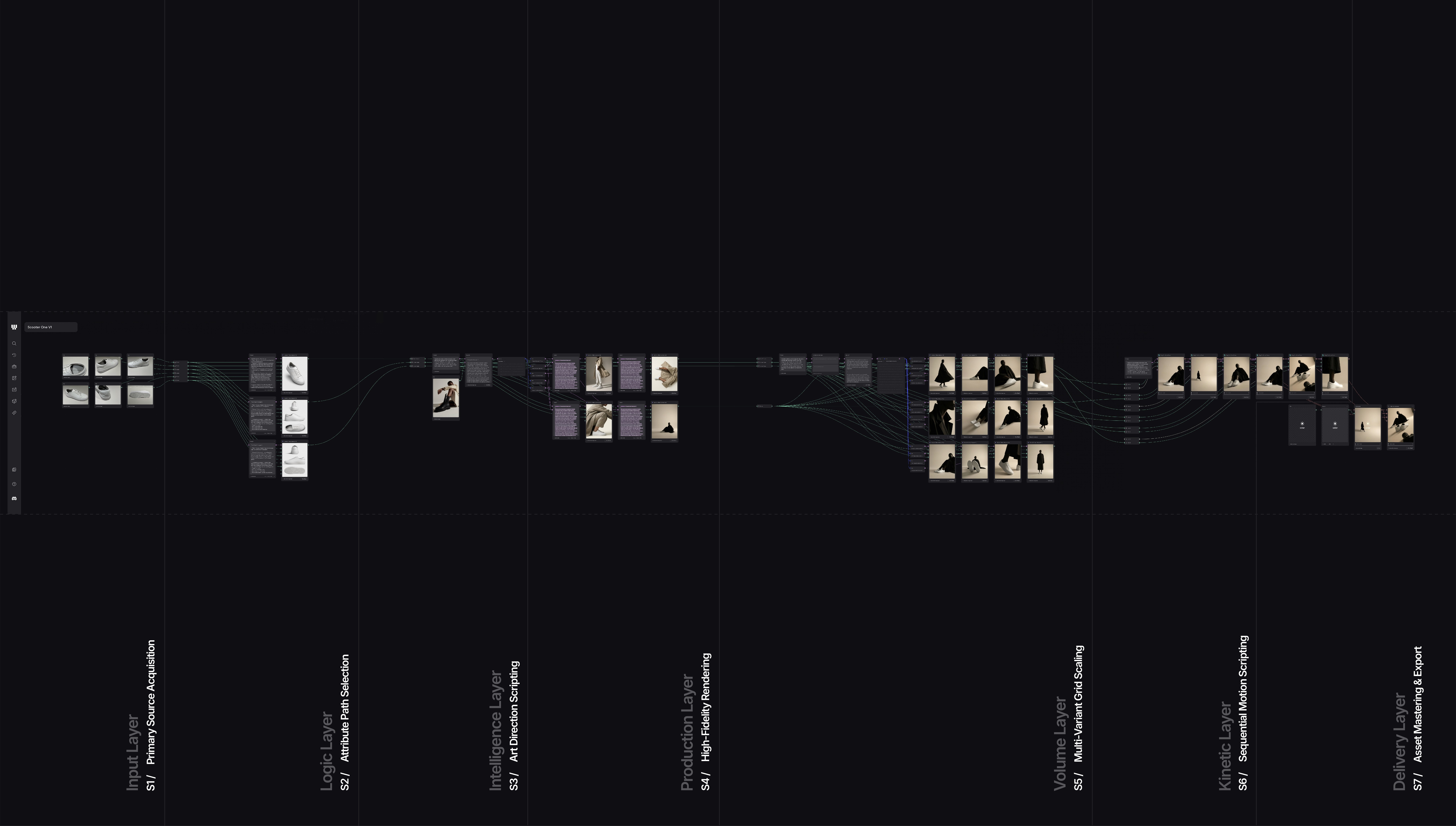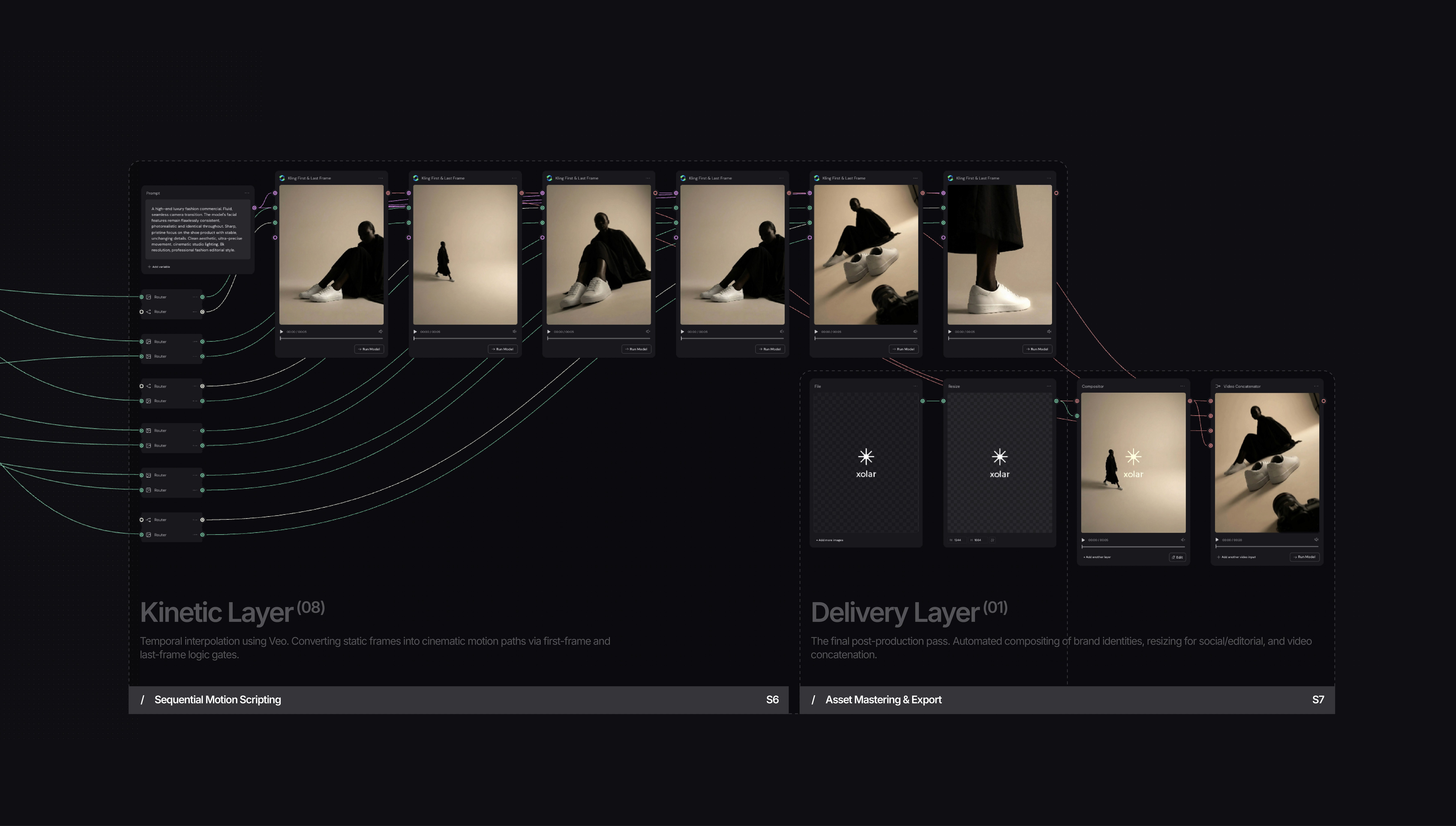 The Xolar architecture utilizes a multi-layered, node-based pipeline to replace manual generative cycles with a standardized engine that ensures absolute brand continuity across high-volume campaigns.